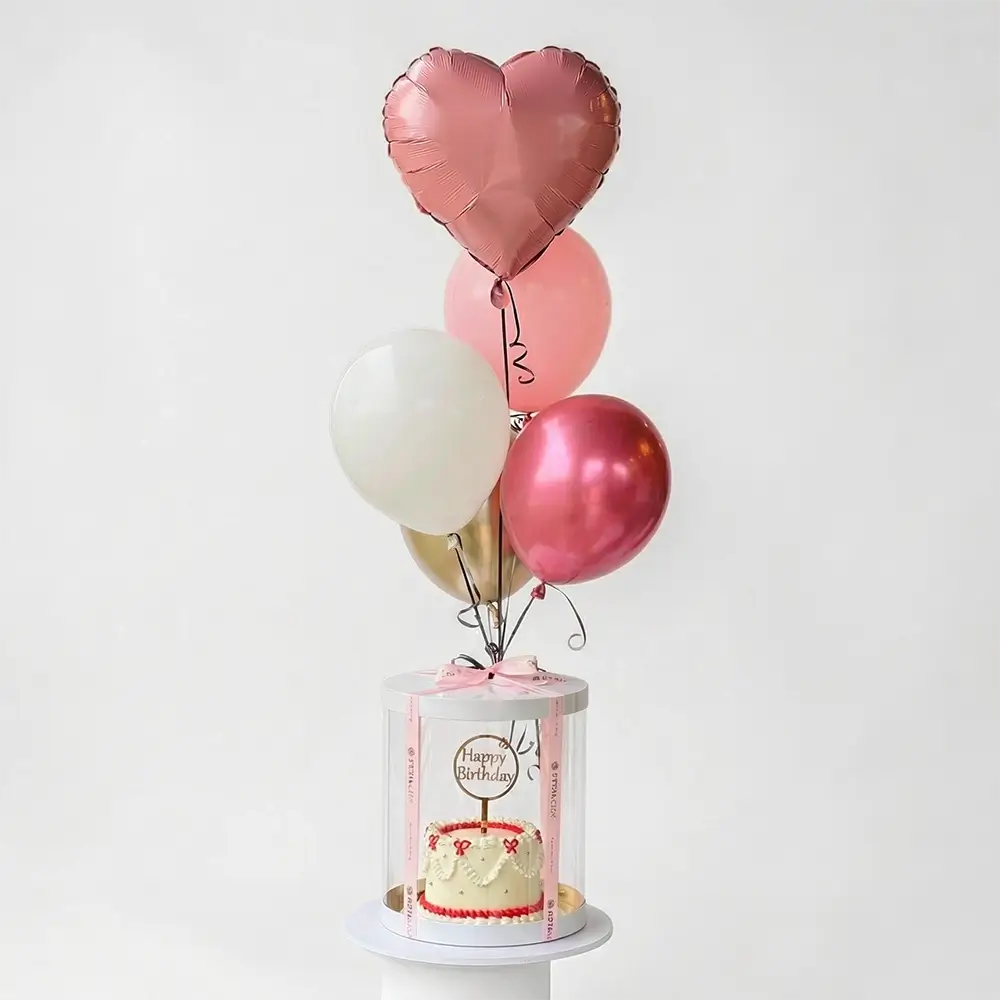 A complete birthday gift set designed to make celebrations simple and special. This cake and balloon arrangement comes neatly packed in a transparent box, creating a clean and elegant presentation from the moment it arrives.