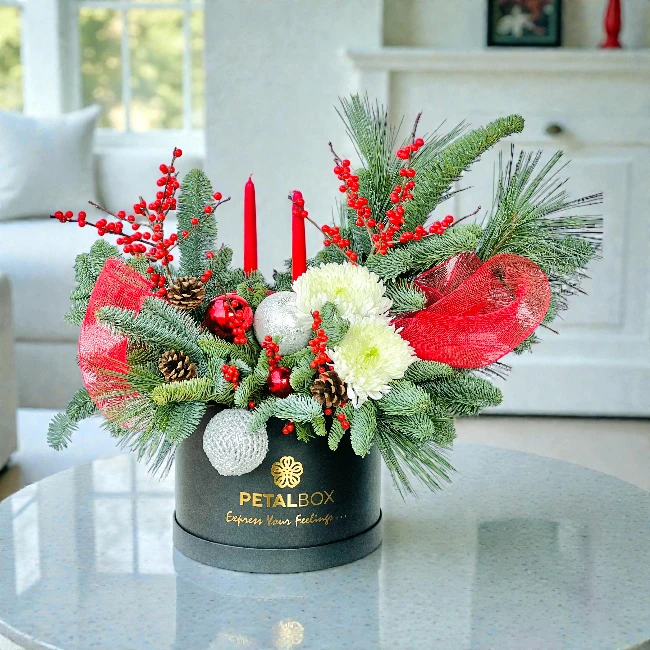 Celebrate the festive season with the Christmas Flower Box Arrangement from Petal Box. This elegant arrangement features fresh white chrysanthemums, vibrant Ilex Verticillate (common winterberry), and lush fir leaves. It is beautifully enhanced with a red net, decorative dry pine cones, and Christmas balls. Two red candles add a warm, festive touch. All elements are arranged in a premium black box, perfect for gifting. This Christmas flower box suits homes, offices, or special celebrations. Ordering is simple, and Petal Box ensures timely delivery across Abu Dhabi and Dubai. Surprise your loved ones with a luxurious floral gift that spreads holiday cheer. Each arrangement reflects craftsmanship and seasonal elegance. Make Christmas unforgettable by sending this charming flower box. It is ideal for family, friends, colleagues, or anyone you want to delight this festive season.