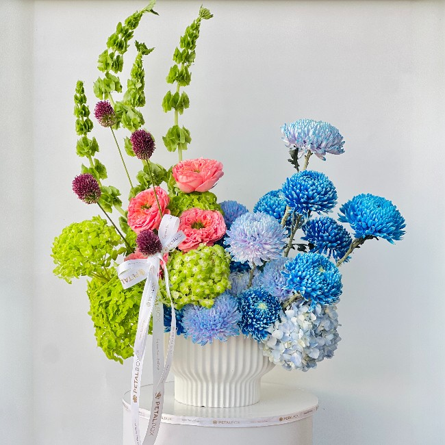 The Coastal Dream Vase by Petal Box captures the beauty of ocean-inspired elegance in every detail. It features light blue and blue chrysanthemum peonies, Rose Candy X-Pression, green and light blue hydrangeas, moluccella, and allium, artfully arranged in a premium white ceramic pot. With dimensions of Ø23cm x H16cm, this vase adds sophistication and freshness to any setting. The calming blend of blue and green tones brings a coastal charm that soothes the senses. Perfect for birthdays, Women’s Day, anniversaries, or any special occasion, this stunning floral arrangement enhances both home and event décor. Celebrate love, beauty, and tranquility with the Coastal Dream Vase, available for delivery across Abu Dhabi and Dubai.