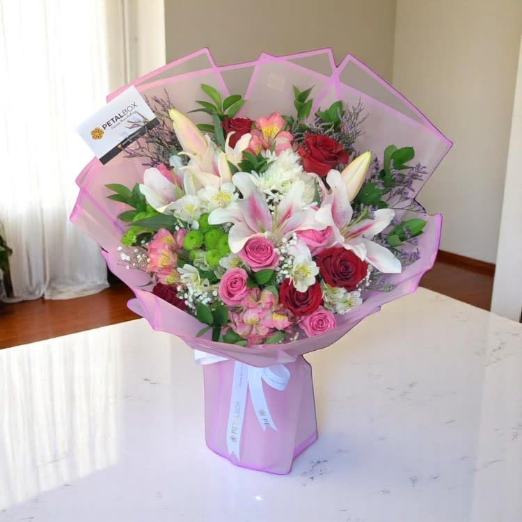 Brighten someone’s day with the Deluxe Joyful Bouquet Roses Lilies from Petal Box. This stunning arrangement features 6 pink roses, 6 red roses, 2 elegant pink lilies, 6 vibrant alstroemeria, 2 green chrysanthemums, fresh green fillers, and delicate white gypsophila. Each flower is carefully handpicked to create a bouquet full of charm and beauty.