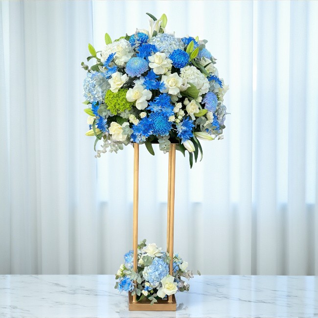 The Heavenly Symphony Stand by Petal Box is a grand floral masterpiece designed to elevate every celebration. It features blue and light blue chrysanthemum peonies, white lilies, white and green hydrangeas, blue hydrangeas, white roses, blue chrysanthemum sprays, and white spray roses. Each bloom is artistically arranged on a tall 160 cm (H) x 60 cm (W) stand, creating a stunning visual display. Perfect for birthdays, Women’s Day, anniversaries, or any special occasion, this arrangement adds elegance and charm to any venue. Moreover, its soft blue and white tones bring a soothing and luxurious feel. Celebrate life’s beautiful moments in Abu Dhabi and Dubai with this timeless floral creation from Petal Box.