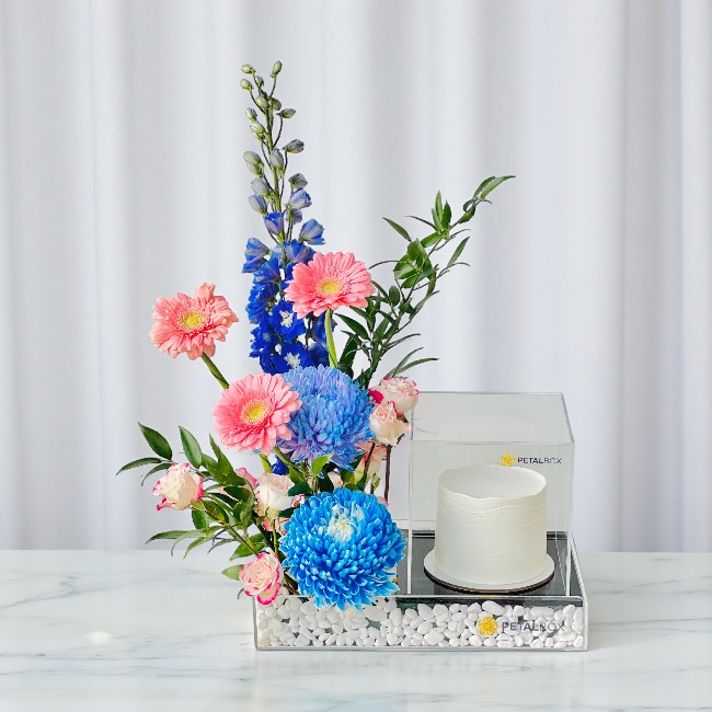 The Pastel Dream Indulgence by Petal Box is a graceful combination of beauty and sweetness, perfect for heartfelt celebrations. It features blue chrysanthemum peonies, blue delphiniums, pink gerberas, and pink spray roses, enhanced with lush Italian ruscus. This floral arrangement comes with a 300g fresh cream vanilla cake, adding a delightful touch to every moment. Moreover, you can choose from strawberry, chocolate, butterscotch, or red velvet flavors for a personalized treat. Presented in a stylish acrylic box, this gift blends elegance and flavor beautifully. Ideal for birthdays, Women’s Day, anniversaries, or any special occasion in Abu Dhabi and Dubai, the Pastel Dream Indulgence makes every celebration more memorable and full of love.