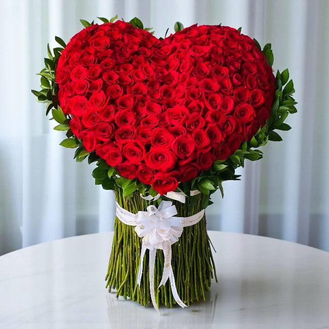 Red Roses,Green Ruscus ,Floral Heart Shaped Arrangement