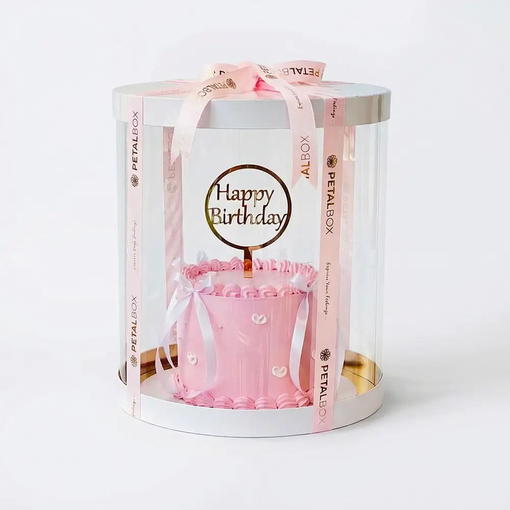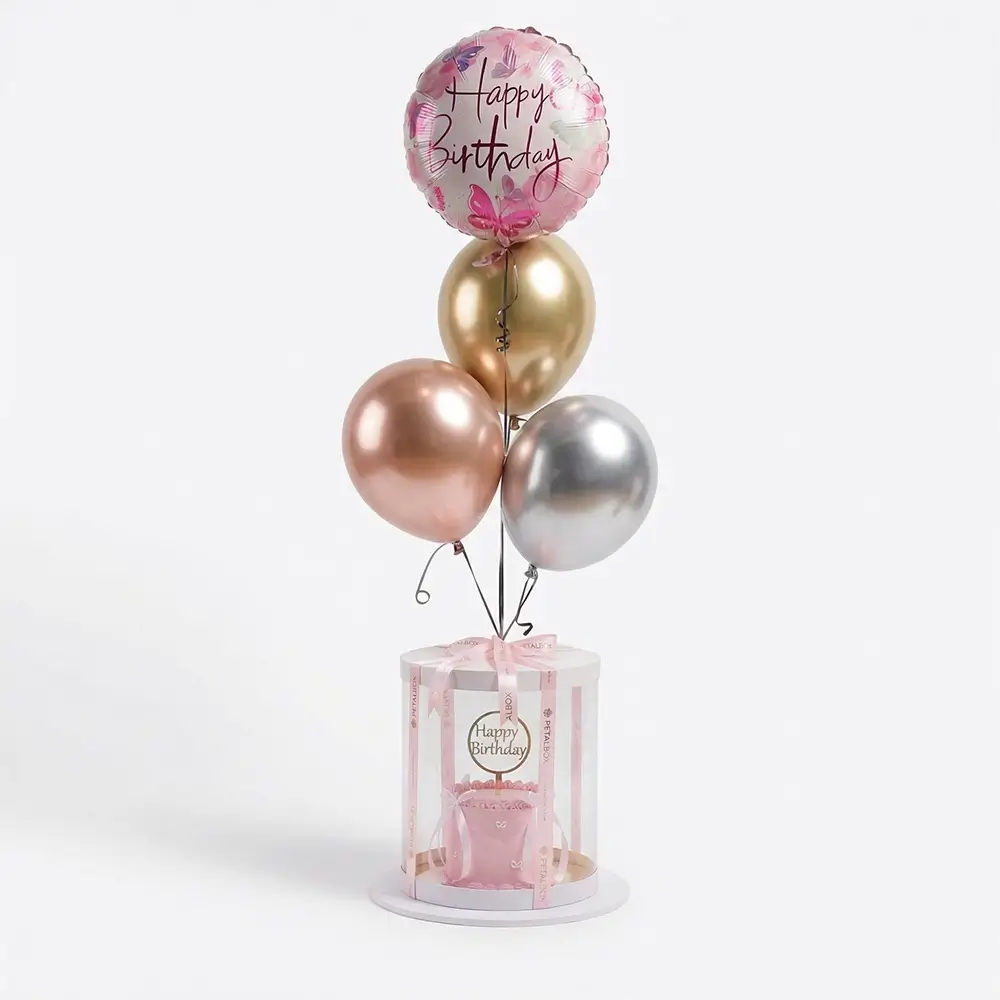 A soft and elegant birthday gift set designed with a pink theme, combining cake and balloons in a clean transparent box. It creates a complete celebration setup in one simple arrangement.