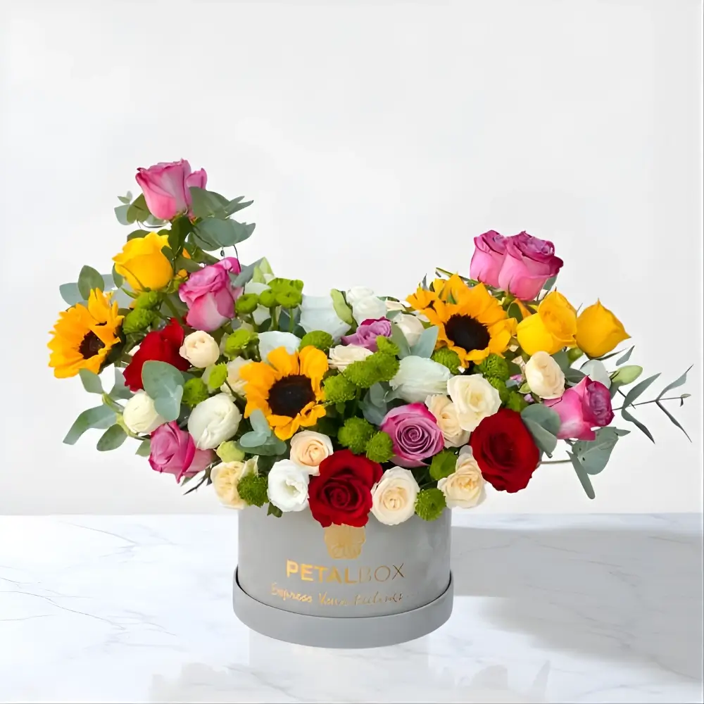 An Easter Floral Hatbox full of colour and individuality that is lively and uplifting. One of Petal Box’s happiest Easter presents for Dubai and Abu Dhabi is Delightful Mixed Blooming, which combines the cheery boldness of sunflowers with a rich blend of roses in deep purple, yellow, and red. A great choice for people who enjoy colour and want to stand out.