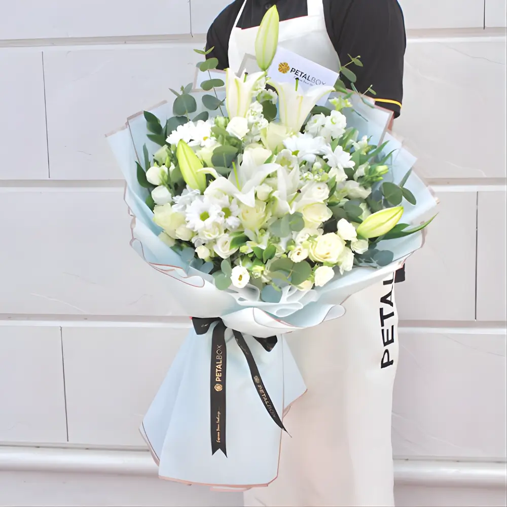 Includes: White Lilies, White Roses, White Santini, White Chrysanthemum, White Lisianthus, White Spray Roses, White Alstroemeria, White Matthiola, Eucalyptus