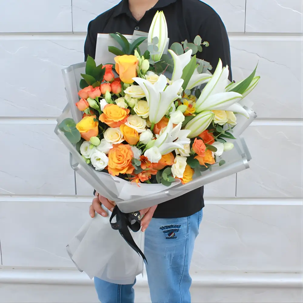 A sun-warmed arrangement that combines the warmth of orange and peach hues with the purity of white Easter lilies. Sunlit Whisper exudes springtime joy and is equally beautiful as a heartfelt gift delivered throughout Dubai and Abu Dhabi or as an Easter Bouquet.
